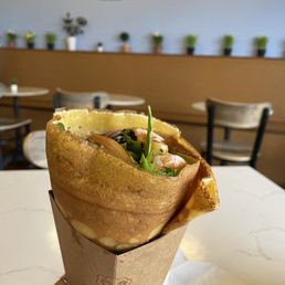 Stopped by for a little snack after lunch. I had the iced mocha with a strawberry banana crepe. The iced mocha was refreshing and it wasn't too sweet. The crepe was crispy, but I noticed its a little flatter than other crepe places. They kinda skimped out on the fillings, especially with the Nutella. Pricing is a little high for what you get. There are tables indoor and outdoor. You can see some students studying here. I would stop by again.
