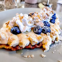Came in for a late breakfast and ordered a dirty chai, blue crab truffle eggs Benedict and a banana Nutella Croftle. Delicious! They had a HUGE menu and I will be back to try other options. The place was super cute, loved the cloud lights. It wasn't very busy and the food took about 15 minutes which was great.